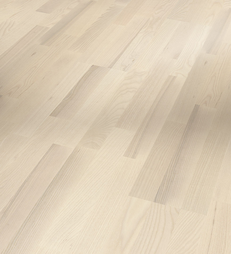 Parador engineered wood flooring Ash 3-strip from the Classic 3060 product line meets the highest demands in terms of design and quality and can satisfy a wide range of design requirements. The high-quality engineered wood flooring has a white matt lacquer finish and creates a very special and natural atmosphere for any living room ambience. The planks of uncompromising quality are available as a 3-strip in the format 2200 x 185 x 13 mm. The Living assortment is characterised by vibrant looks and stresses the earthy character of the wood. The design of the planks has no bevels, so that the planks join together without any noticeable gaps, creating a uniform and harmonious installation pattern. Durable and stylish in installation, Parador Classic 3060 engineered wood flooring is easy to install thanks to an Automatic-Click system with long and end edge locking. The all-round impregnation of the lamellas and top layers ensures reliable swelling protection. The top layer is about 3.6 mm high. This engineered wood flooring is suitable for installation on underfloor heating systems. The manufacturer's guarantee is 25 years. For the production of Parador engineered wood flooring from the Classic 3060 product line, wood from sustainably managed sources is predominantly used. Parador engineered wood flooring has received several certifications.