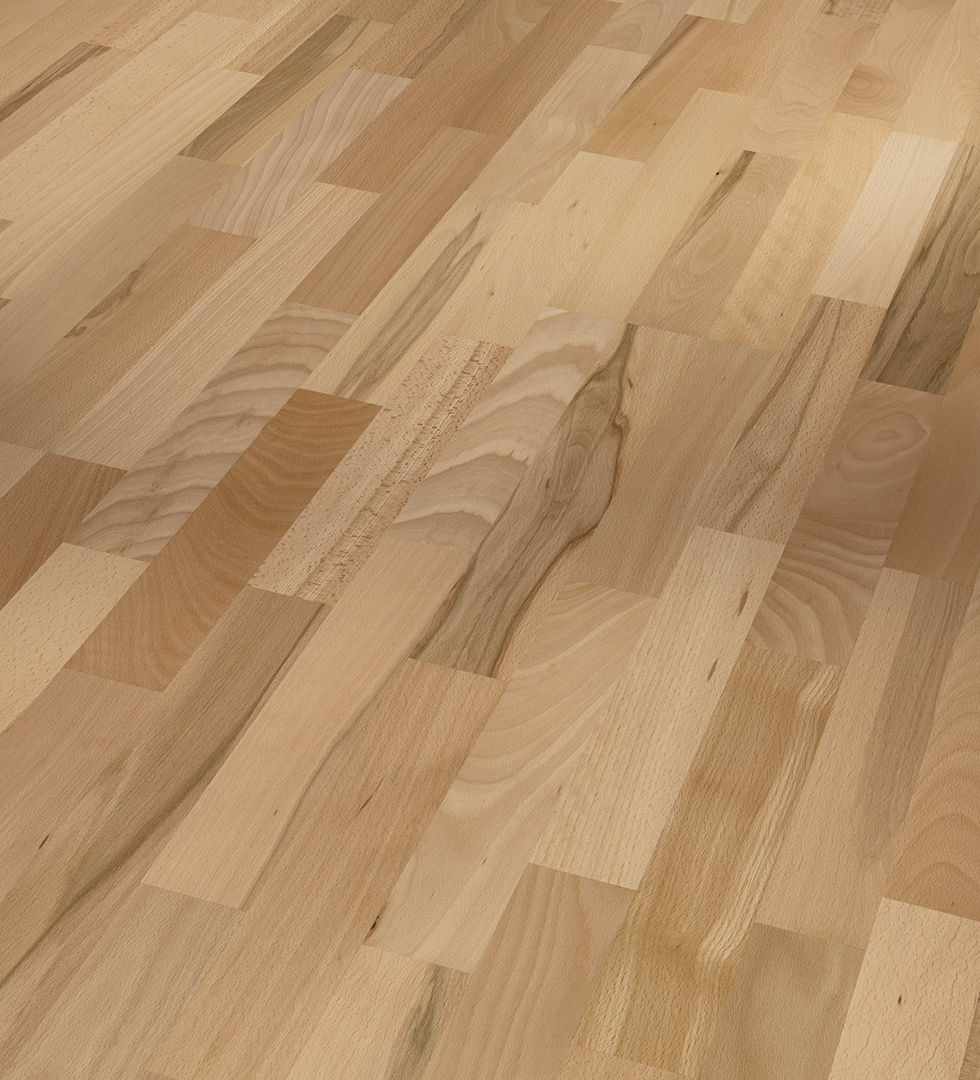 Parador engineered wood flooring Beech 3-strip from the Basic 11-5 product line is an attractive engineered wood flooring with a top layer of solid wood in matt lacquer, which enables price-conscious interior design with individual and high-quality engineered wood flooring. Suitable for everyday use and easy to maintain, this convincing natural product offers a wide range of design options. This Parador engineered wood flooring from the Basic 11-5 product line is available as a 3-strip in the format 2200 x 185 x 11.5 mm. Its design with no bevel ensures a closed and uniform installation pattern. The Rustikal assortment, due to its knotty appearance, the pronounced play of colours and its distinct grain, appears particularly original. Parador engineered wood flooring Basic 11-5 has an Automatic-Click system and is easy to install – also thanks to the low installation height of 11.5 mm. The top layer is about 2.5 mm high. The engineered wood flooring is even suitable for installation on underfloor heating systems. This flooring has reliable swelling protection due to an all-round lamella and top layer impregnation. A manufacturer's guarantee period of ten years is granted.