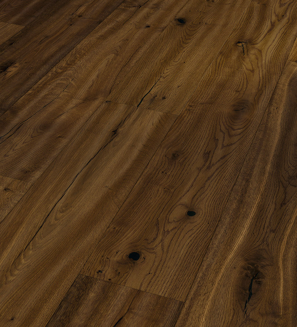 Parador engineered wood flooring Oak smoked handscraped brushed wide plank from the Trendtime 8 product line is a refined engineered wood flooring with a solid oak top layer in natural oil plus, which makes many design dreams come true. As a wide plank in the format 1882 x 190 x 15 mm, the engineered wood flooring blends harmoniously into living spaces and gives the rooms a particularly natural atmosphere. The Classic assortment boasts a vibrant range between a harmonious, natural and earthy look. This engineered wood flooring also impresses with its handscraped texture. The outstanding feature of this texture is the surface, which is processed by manual planing, giving the wood a particularly original character. The 4-sided bevel emphasises each plank individually and visually enhances its length effect. An Automatic-Click system with long and end edge locking ensures that Parador engineered wood from the Trendtime 8 product line is particularly easy to install. The all-round lamella and top layer impregnation ensures reliable swelling protection. The top layer is about 4 mm high. Engineered wood flooring in this product line is suitable for installation on underfloor heating systems. The guarantee period granted by Parador is 25 years. For the production of Parador engineered wood flooring from the Trendtime product line, wood from sustainably managed sources is predominantly used. Parador engineered wood flooring has received several certifications.